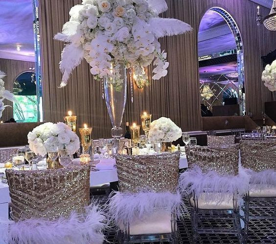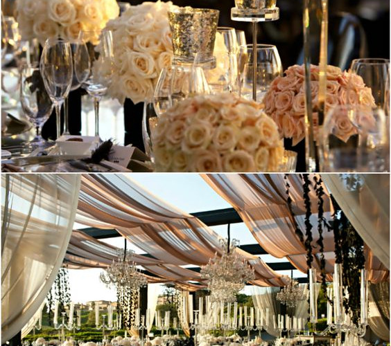 Candelabros es la decoración para darle ese toque elegante. Colores Ivory, blanco en conjunto con el color de la boda. Lugar: Jardín o salón antiguo. Vajilla con toques dorados